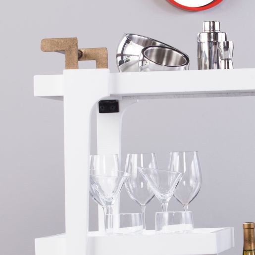 Sleek black and aged brass highlight the midcentury modern profile. Poplar, engineered wood, birch veneer, plated iron tube. Glass rolling bar serving cart drinks trolley caddy wine rack cocktail station. Sleek lines and aged brass highlight the midcentury modern profile. Fresh white and aged brass highlight the midcentury modern profile.