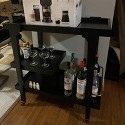 This drink cart's black and aged brass, open shelving, and locking castors will stop traffic at your next soiree.